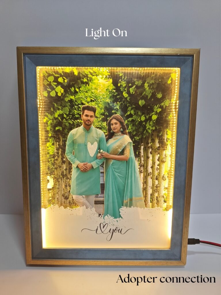Illuminate your memories with our Personalized LED Light Photo Frame (9×12 inches) — a beautiful and romantic gift choice for couples. This customized photo frame features soft glowing LED lights, a sturdy wood finish, and a touching “I ❤️ You” message, making it a standout piece for home décor. Comes with a free adopter connection, making it easy to light up your special moment anytime. Ideal for anniversaries, weddings, birthdays, or as a romantic personalized gift for your partner. A perfect mix of elegance, love, and creativity!